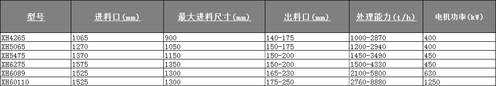 XH 旋回式破碎機(jī)擁有精細(xì)的破碎腔設(shè)計(jì),確 保更強(qiáng)的生產(chǎn)能力、更大的進(jìn)料粒度及更長(zhǎng)的襯板 壽命;大傾角和長(zhǎng)破碎面設(shè)計(jì),配合優(yōu)化設(shè)計(jì)的沖 程和轉(zhuǎn)速,使破碎機(jī)具有超強(qiáng)的破碎能力,適用于 各種粗碎破碎作業(yè)需求;通過(guò)簡(jiǎn)單更換偏心套,就 可以改變破碎機(jī)的處理能力,以滿(mǎn)足不同的破碎工 藝需求。